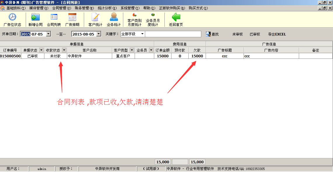 3、合同管理:統(tǒng)一管理客戶往來業(yè)務合同,隨時了解客戶廣告信息到期狀態(tài),