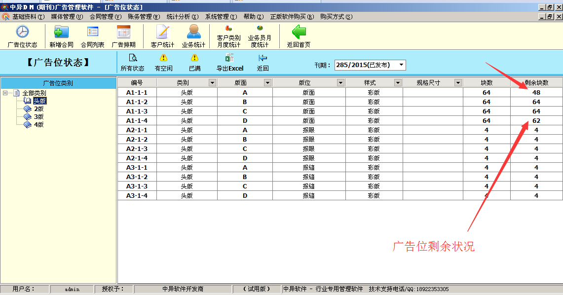 1、基礎(chǔ)資料管理:客戶資料管理、媒體資源管理( 刊期設(shè)置、版面版位設(shè)置、版位廣告刊登狀況)、財務收支 等信息設(shè)置。