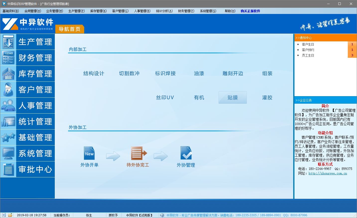 廣告標識標牌ERP管理系統(tǒng),為企業(yè)量身定做,簡化公司管理,提高員工工作效率,免費下載試用 測試用戶名:admin 密碼:空
