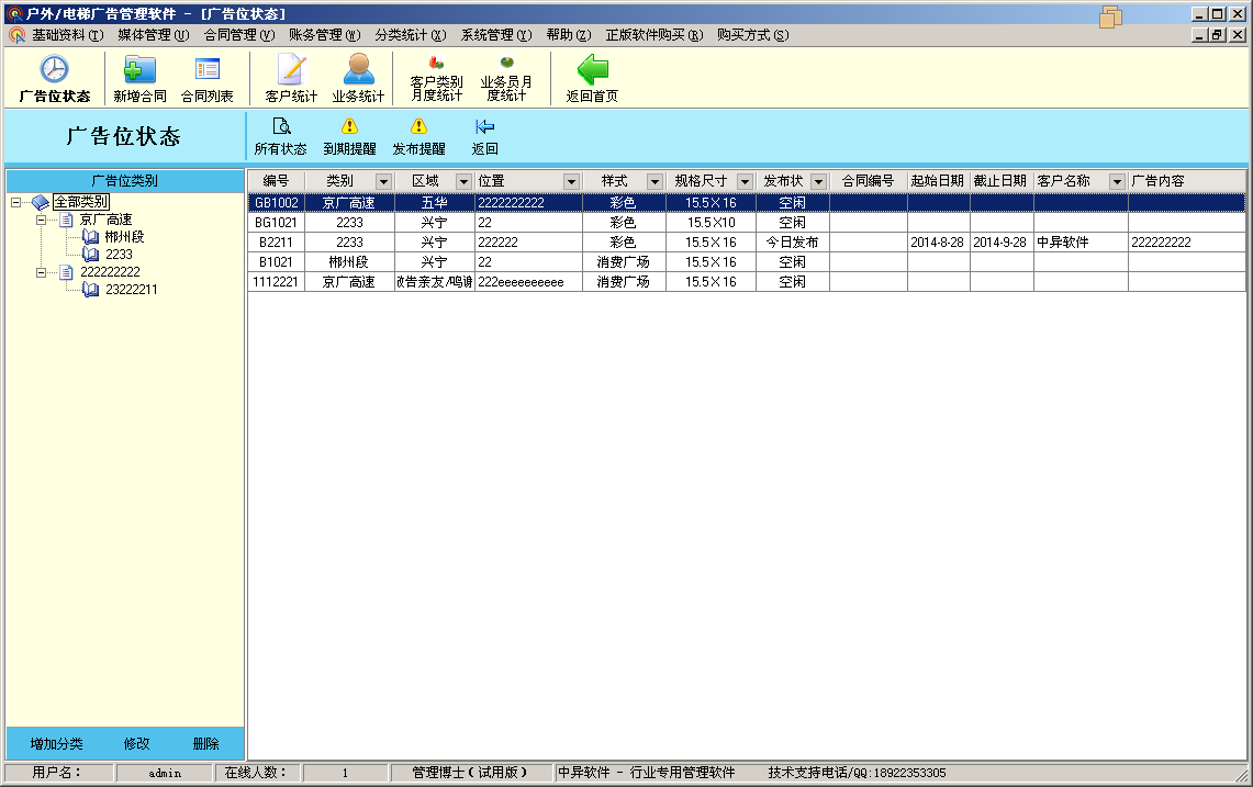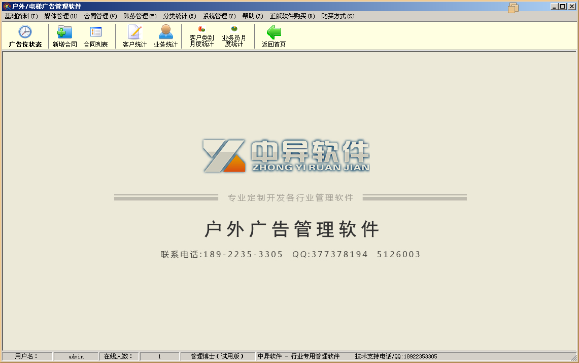 戶外廣告管理軟件適應于各類以 廣告位、廣告牌 經(jīng)營的廣告?zhèn)髅焦居涃~管理軟件,戶外樓宇公交高速機場火車地鐵商超廣告位廣告牌管理軟件系統(tǒng)。
